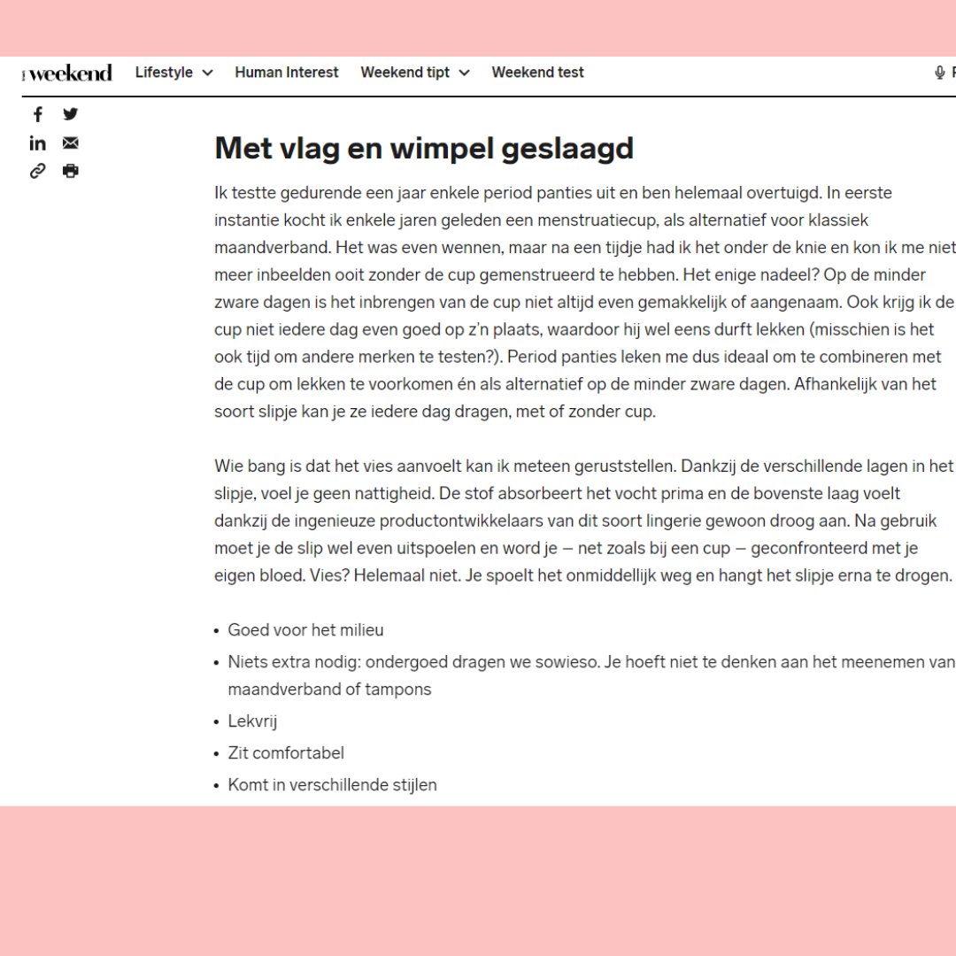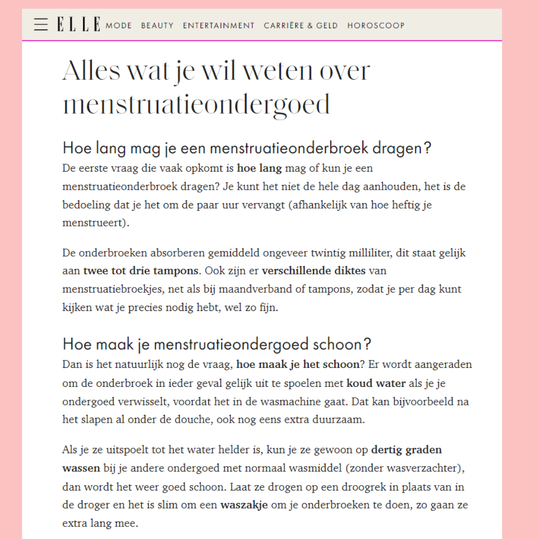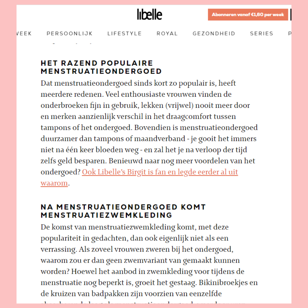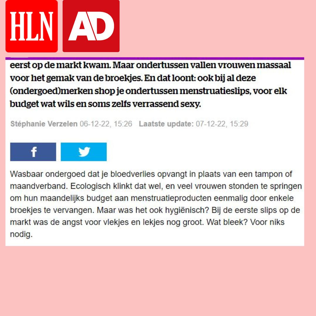 Het is niet altijd simpel voor jonge meisjes die net hun menstruatie kregen om maandverband of tampons te gebruiken. Op school is het niet evident om deze te wisselen. Je moet zorgen dat het niet opvalt als je de bescherming (die trouwens veel geluid maakt) uit je boekentas neemt, enz… Ook voelen ze zich wat ‘anders’ omdat ze met een dik maandverband of tampon zitten. Een menstruatieslip helpt hen hierbij; Ze hebben een leuk, meisjesachtig design en zitten waanzinnig comfortabel; Omdat ze goed aansluiten moeten ze zich geen zorgen maken, zelfs niet bij het sporten. Het is goed voor hun zelfzekerheid, voor de natuur, en voor de portemonnee van de mama 😉 .